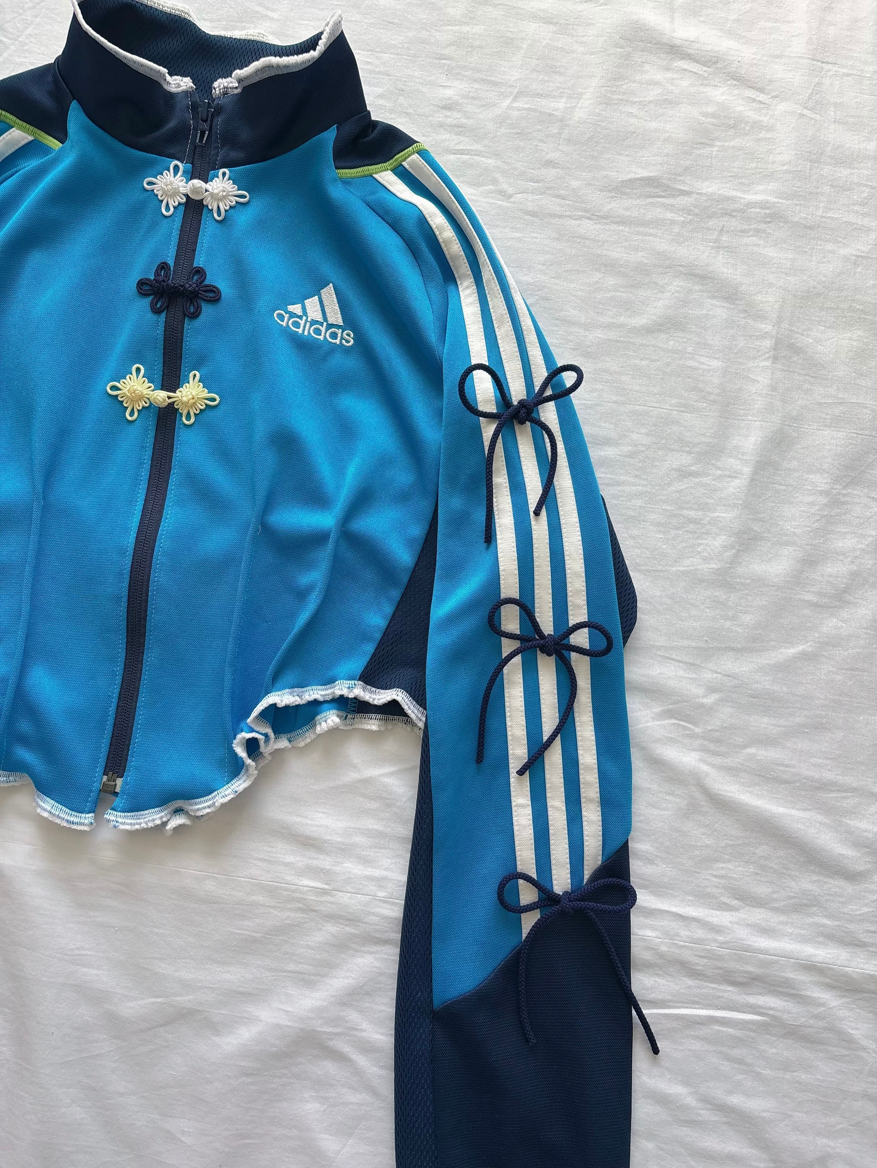 コルセットデザインにリメイクされたトラックジャケットは、洗練されたスタイルを演出します。袖リボンとチャイナボタンのディテールが、他にはない個性を引き立てます。どんなコーディネートにも華やかさを添え、特別な日だけでなく、日常使いにも最適です。