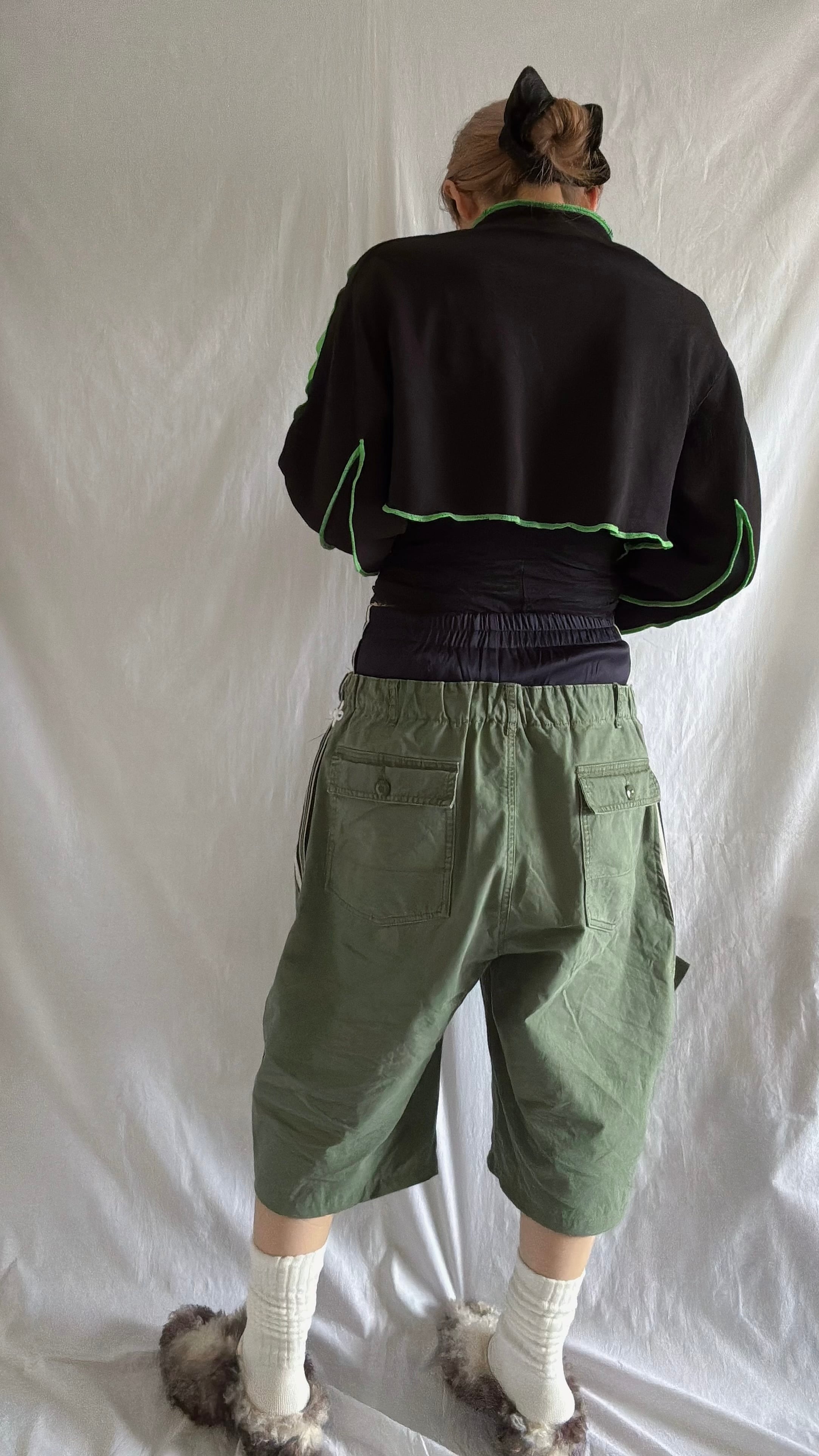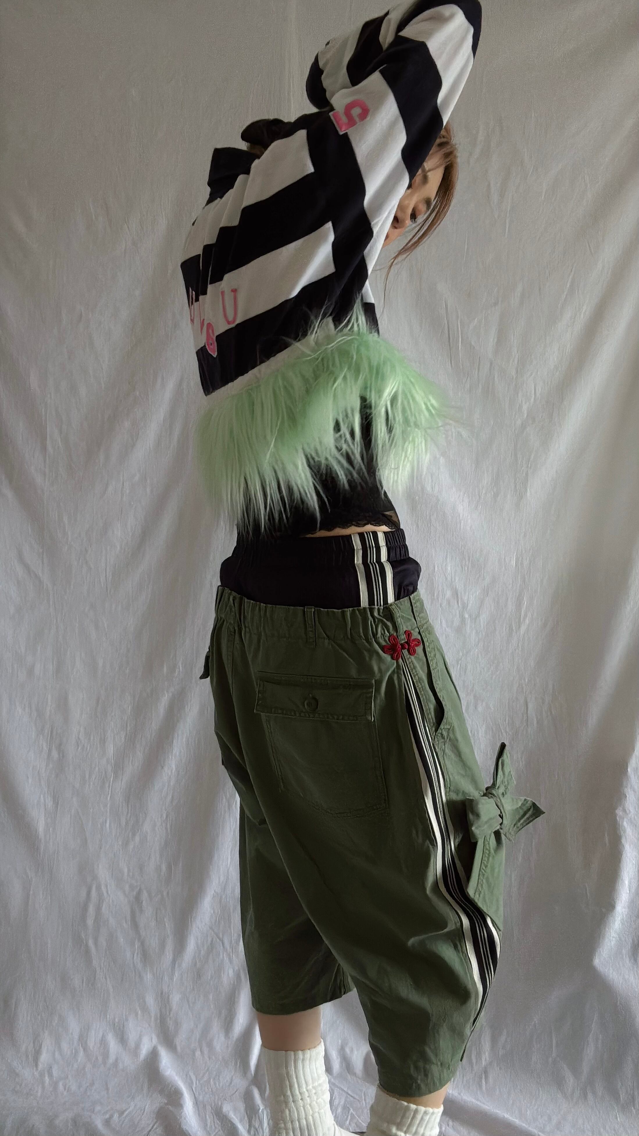 ジャージとカーゴパンツを融合させたRe:make ダブルウエストハーフパンツは、個性的なデザインと快適性を兼ね備えた一着です。大きなリボンがアクセントになり、カーブしたシルエットがかわいらしさを引き立てます!デイリーユースからお出かけまで、さまざまなシーンで活躍するアイテムです。